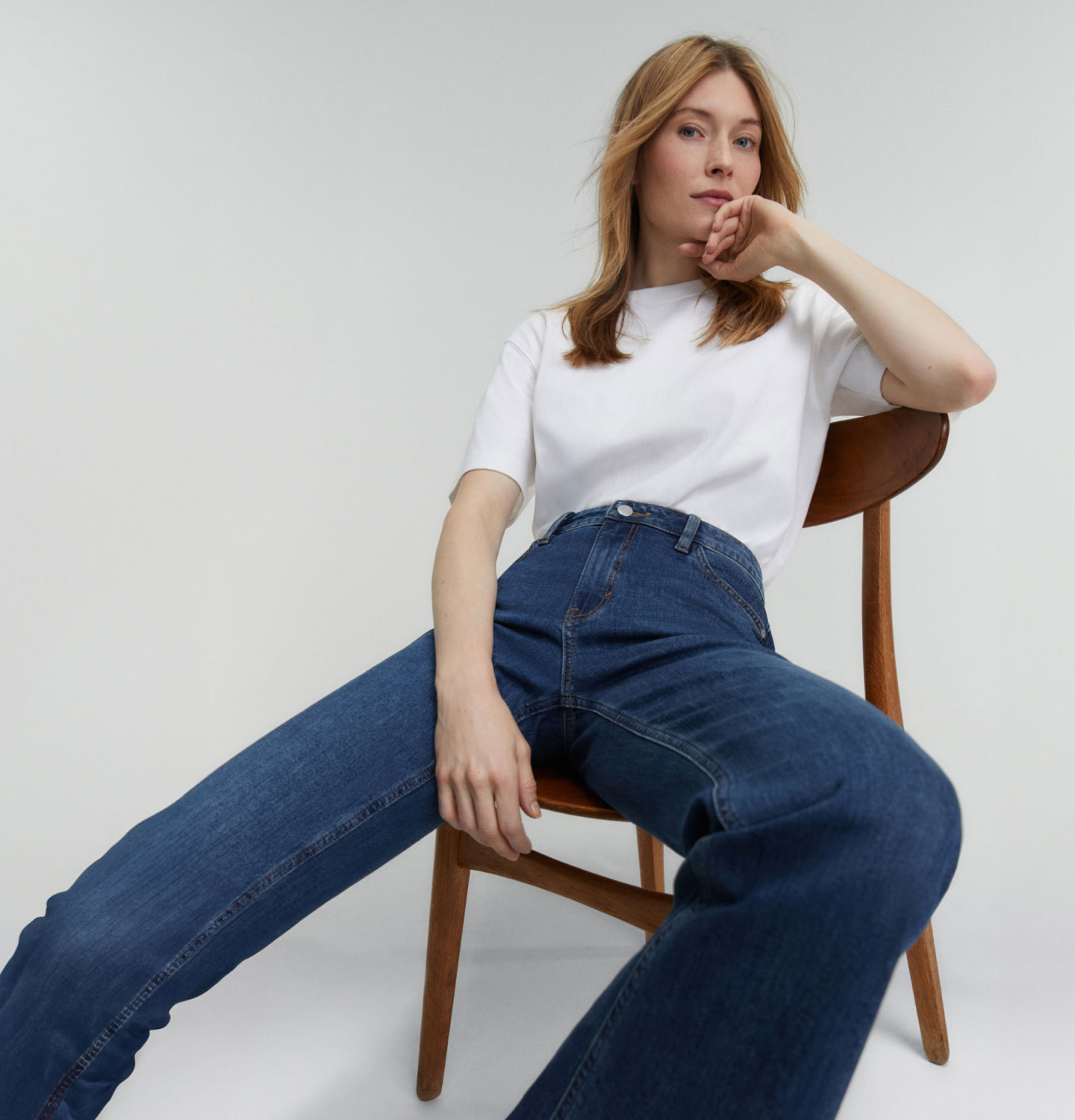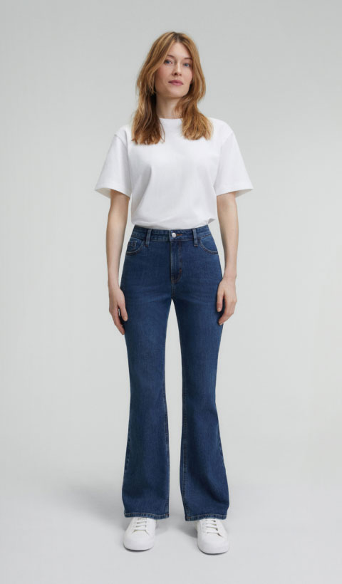 Die Jeans mit dem Sanduhr-Effekt. Schmal am Oberschenkel, unten mit Schlag.